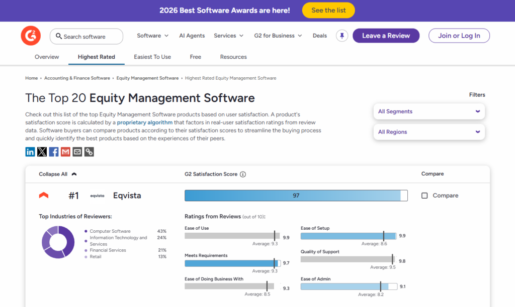 Eqvista is now ranked #1 in equity management on G2, not by analysts, not by a panel, but by the founders, finance leaders, and investors who run their cap tables on it every day. For a space crowded with legacy tools and spreadsheets, this is a strong signal that the market is voting with real usage, not just marketing claims.