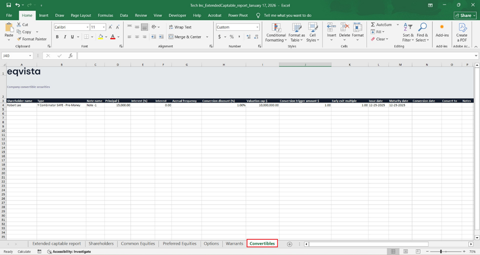 To view the details, click on the second sheet with the name “Captable” to get the following page.