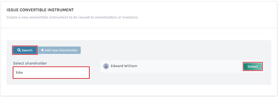 If you have already added the shareholder profile in the cap table, you can just type in the name in the search box and the name will appear on the side of it. Click on “Select” and begin the process of issuing the note.